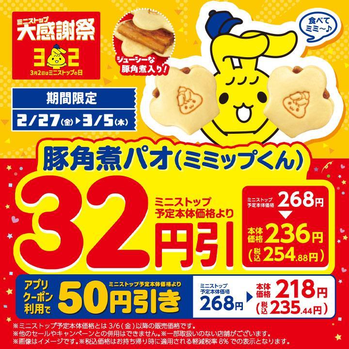 2月27日から3月5日までの期間、「豚角煮パオ(ミミップくん)」を予定本体価格から32円引きで購入できます。