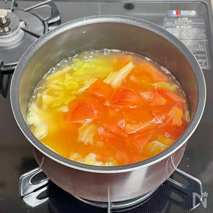 (3) キャベツが柔らかくなってきたらトマトを入れて煮立たせ、【B】を合わせて作った水溶き片栗粉を加えてとろみをつける。仕上げにごま油を加える。
