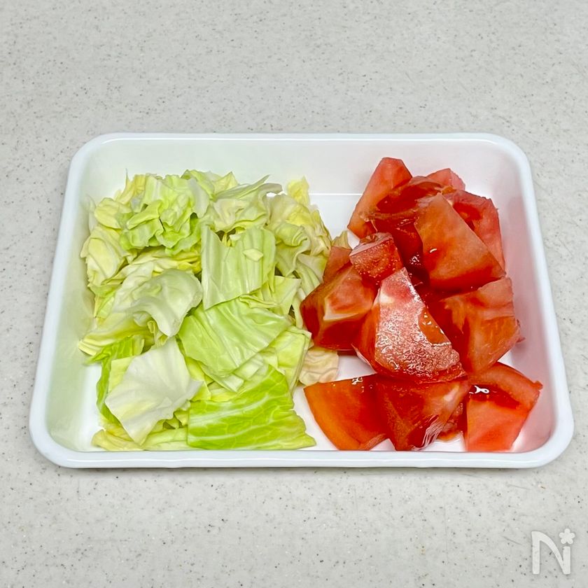 (1) 春キャベツは食べやすい大きさにちぎり、トマトはひと口大のざく切りにする。