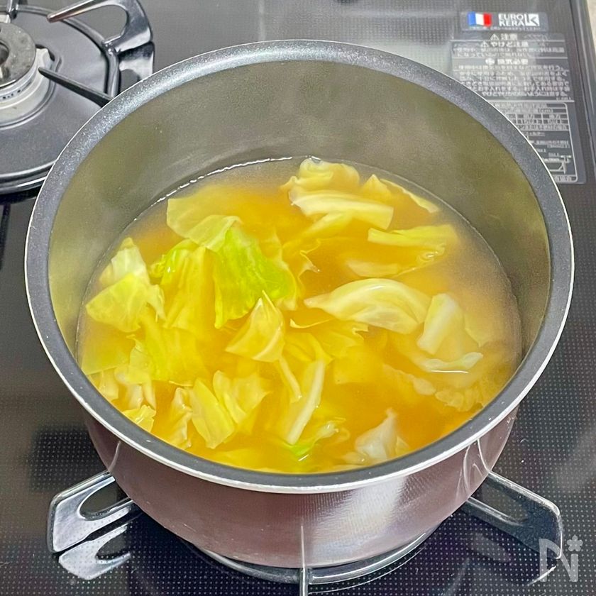 (2) 鍋に【A】を入れて火にかけ、沸騰したらやや火を弱めてキャベツを入れる。