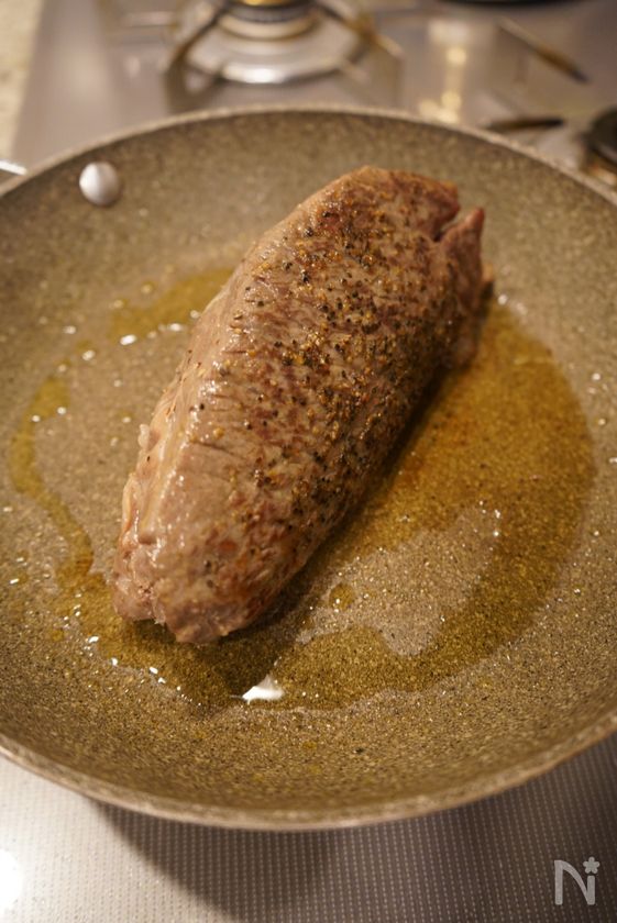 出来上がったらフライパンにオリーブオイルを入れ熱し中火から強火で全面焼き色をつける。