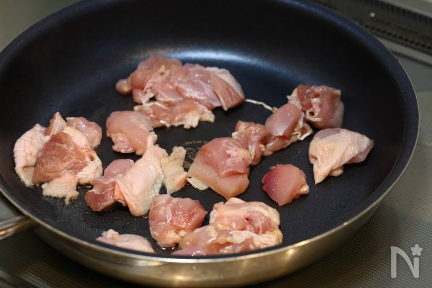 (2) フライパンにサラダ油を熱し、鶏もも肉を焼く。