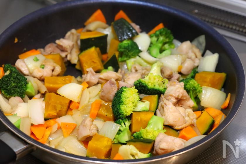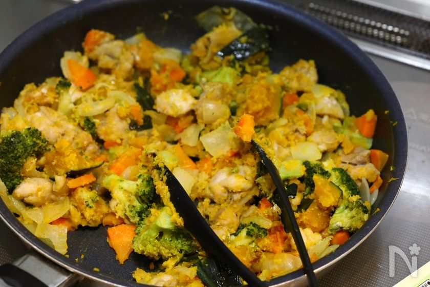 (3) 玉ねぎ・人参・ブロッコリーに塩こしょうをふり、しんなりするまで炒める。バター、かぼちゃの半量を加え、サッと炒め合わせる。
