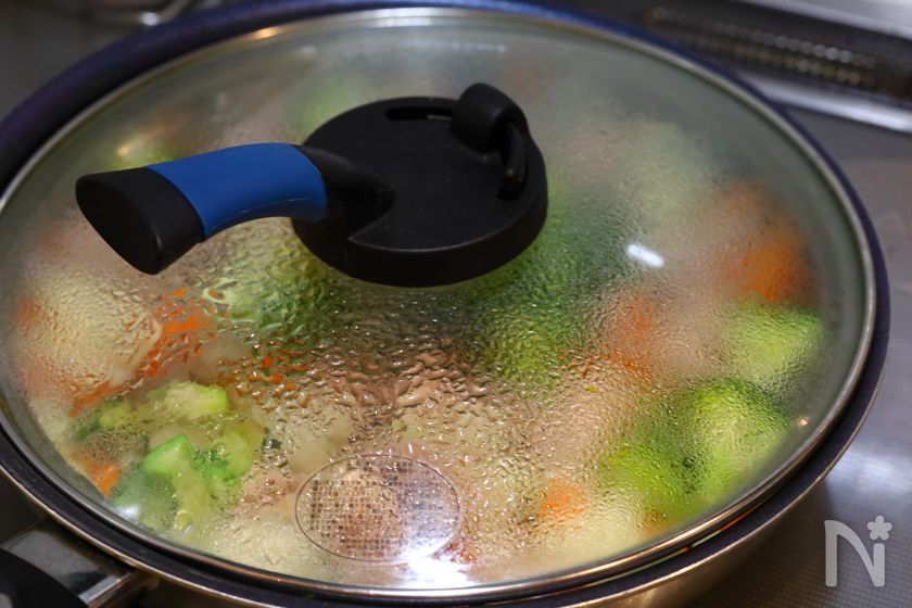(4) フライパンで蓋をして弱火で10分蒸し焼きにする。