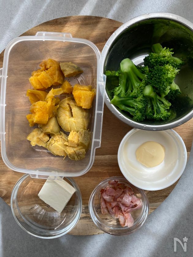 (2) ボウルにさつまいも・クリームチーズ・ブロッコリー(茹で)を入れて混ぜ、【A】を満遍なく混ぜ合わせ器に盛りお好みで黒ごまをふるう。