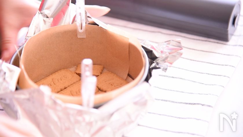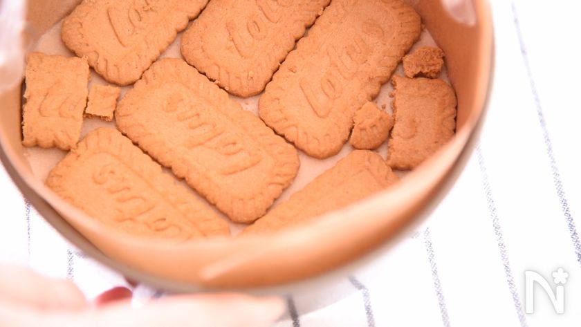ケーキ型にオーブンシートを敷いておく。ロータスビスケットを敷き詰める。小さな隙間には小さく割ったビスケットを敷く。