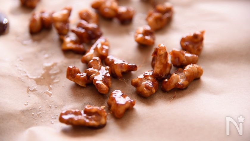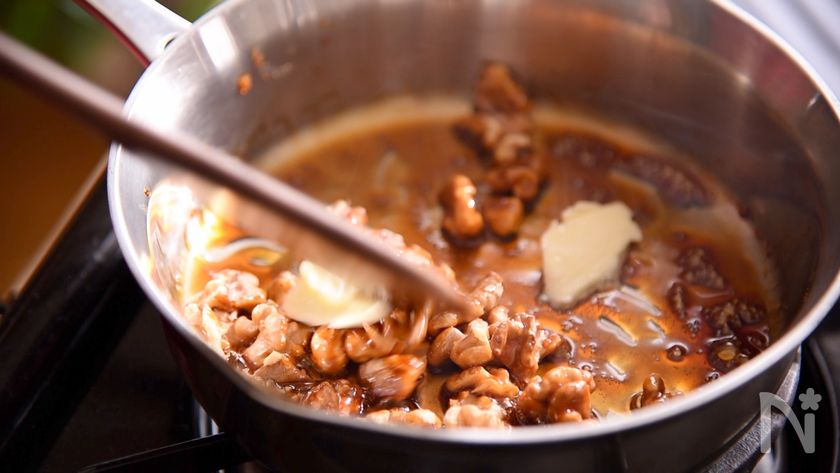 (12) 茶色く色付いたらすぐに火を止め、炒りくるみを入れる。バターを入れて混ぜる。