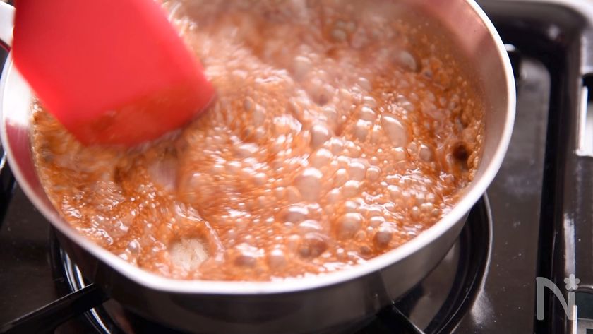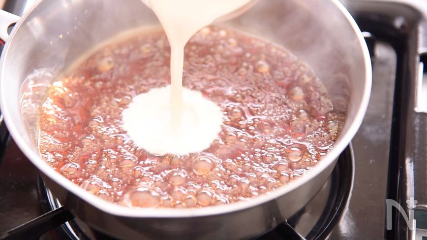 (15) 茶色になってきたらすぐ火を止め、常温の生クリームを入れて混ぜる。