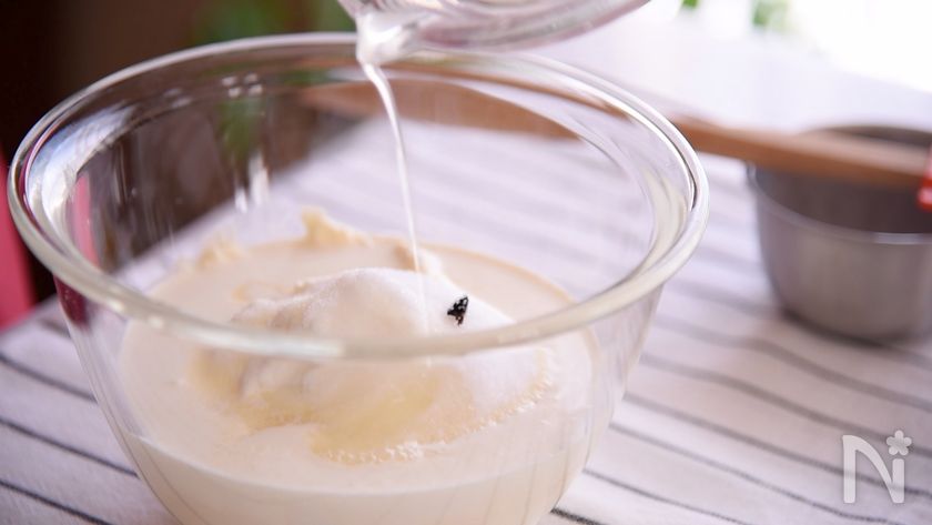 (4) ボウルにクリームチーズ、ギリシャヨーグルト、生クリーム、グラニュー糖、レモン汁、バニラビーンズの種、コーンスターチを入れてよく混ぜる。