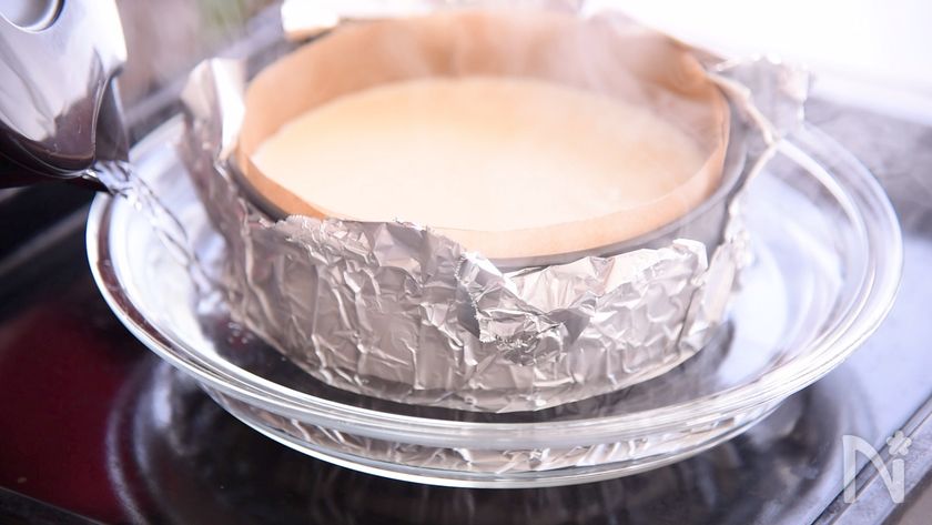 (7) 180度に予熱したオーブンで。20分、160度に下げてさらに40分湯煎焼する