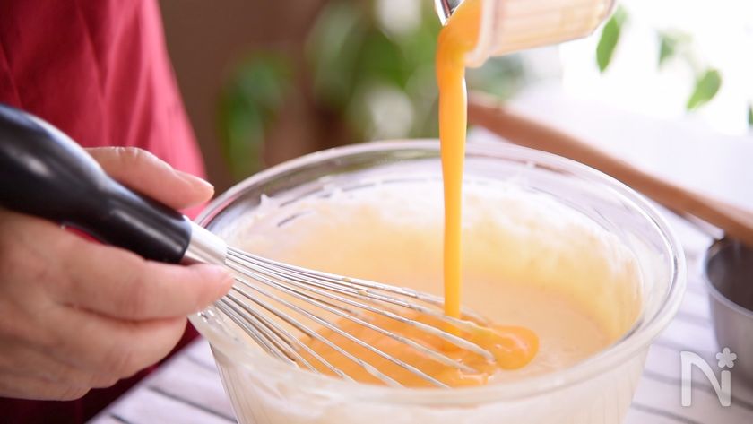 (5) 溶いた卵を入れて混ぜる。コーンスターとを入れて混ぜる。ミキサーやブレインダーを使ってもいいです。