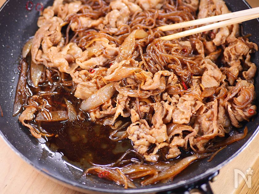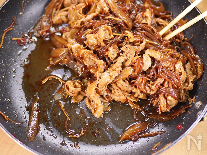 (5) 糸こんにゃく、しょうが、【A】を加え、煮汁が若干残るまで中火で炒めながら煮詰めていく。