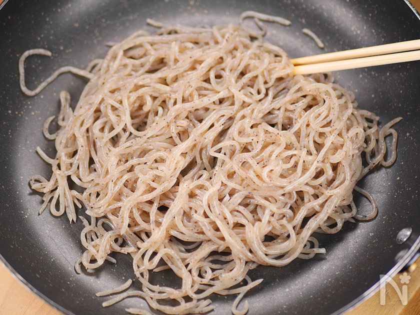 (2) フライパンに糸こんにゃくを入れ、強火で約3分乾煎りし、いったん取り出す。