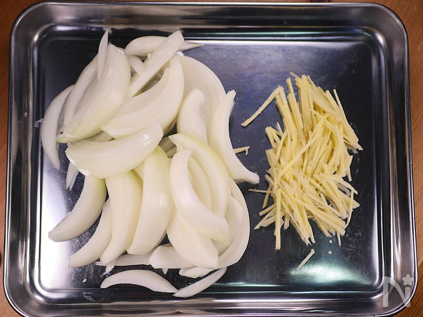 (1) 玉ねぎはくし形切り、しょうがは千切りにする。