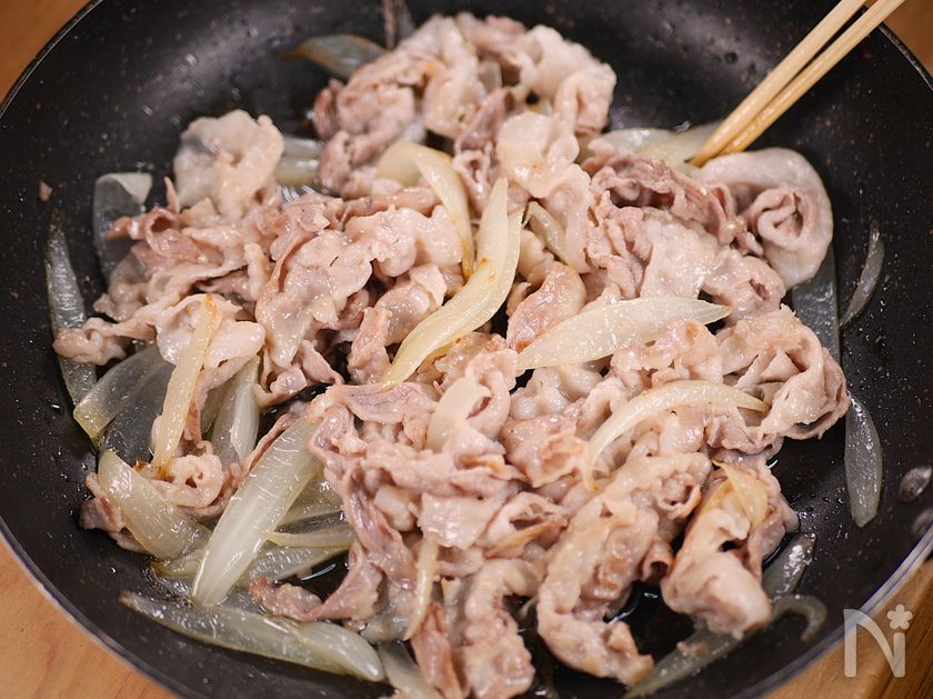 (4) 豚バラ薄切り肉(食べやすい長さに切る)を加え、強めの中火でしっかりと炒め合わせる。