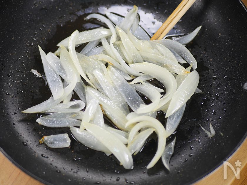 続けてサラダ油(大さじ1/2、分量外)、玉ねぎ、塩ひとつまみ(分量外)を入れ、弱めの中火でじっくり炒めてしんなりさせる。