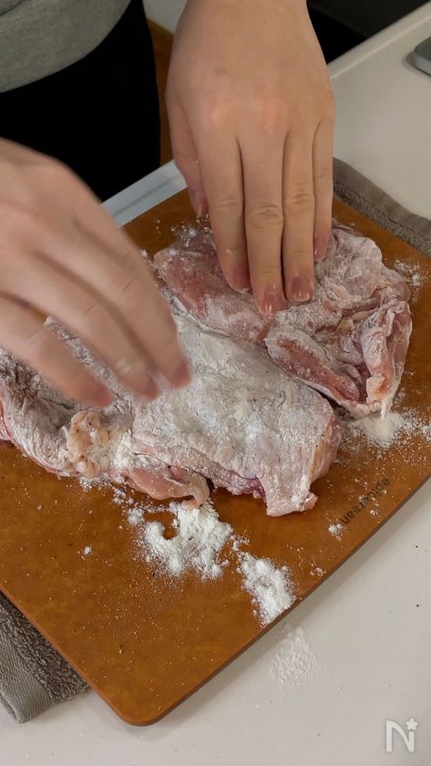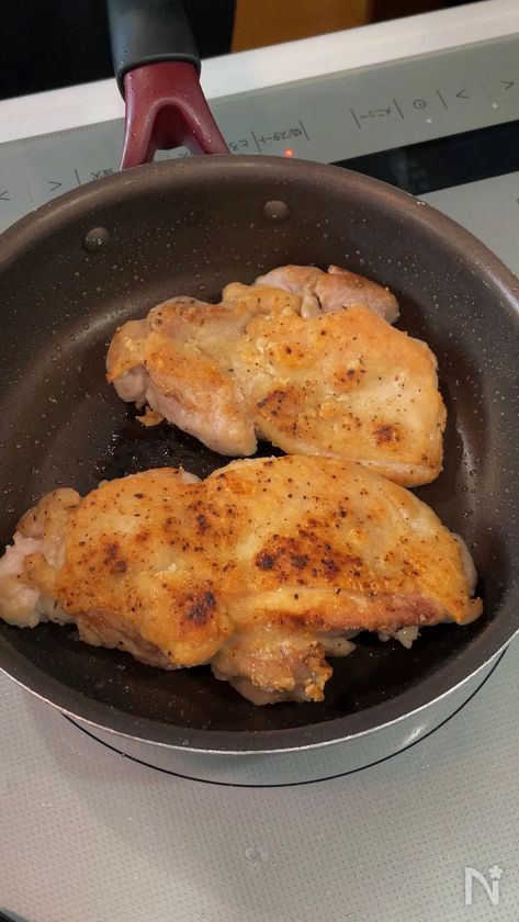 (1) 鶏モモ肉の両面にクレイジーソルト→米粉をまぶし、油をひいたフライパンに皮目から入れ、強中火で焼く。焼き目が付いたら裏返し、弱火で身側を5分焼く。