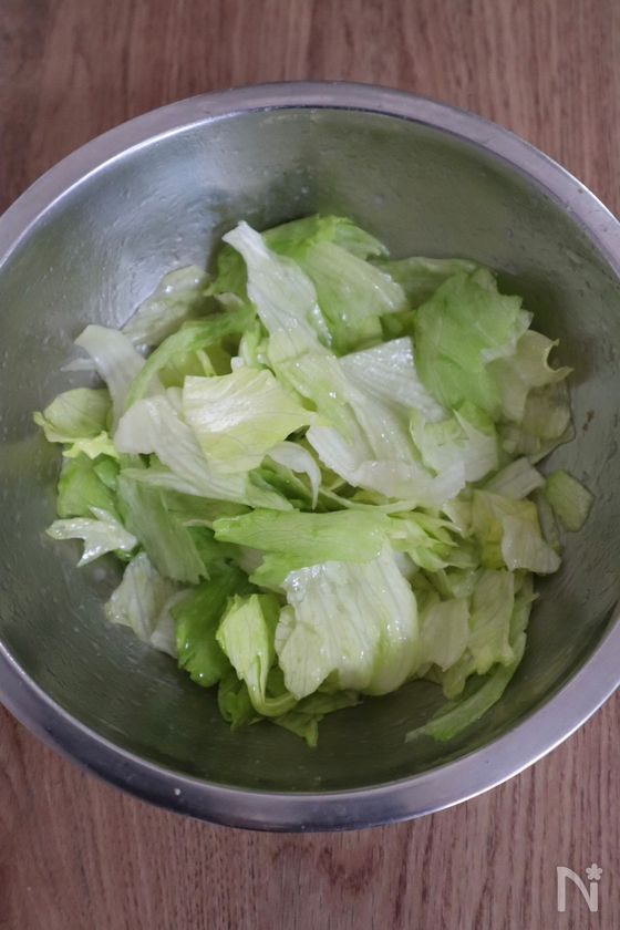 (1) ボウルに食べやすい大きさにちぎったレタスと【A】を入れ、全体に味がなじむようによく混ぜ合わせる。