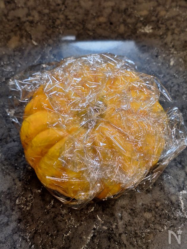 (1) 坊ちゃんかぼちゃをラップで包み、電子レンジ(600W)で8分加熱し、粗熱をとる。
