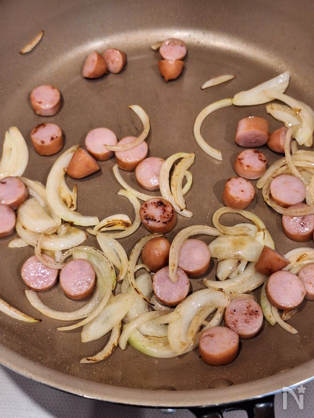 (5) ウインナーを加えて炒め合わせ、油分がなじんだら塩こしょうをふって火を止める。