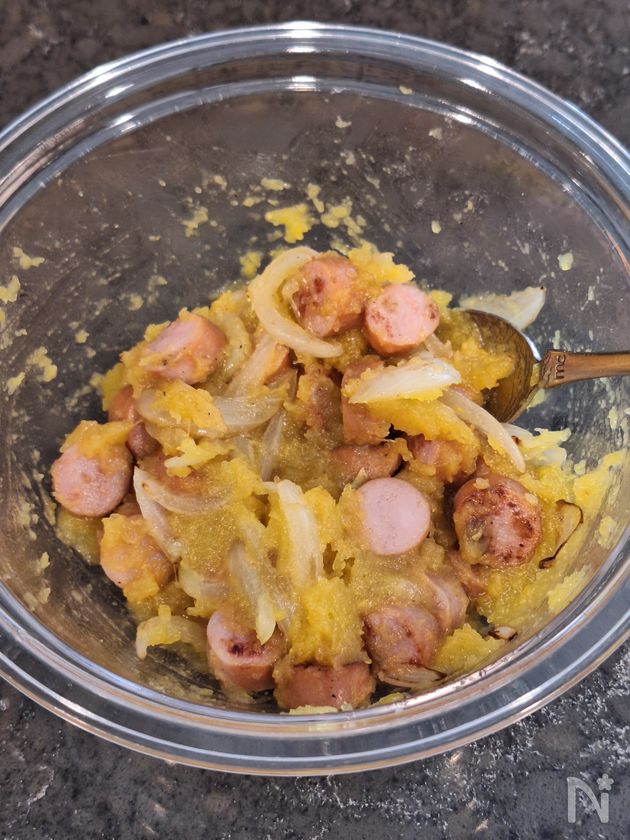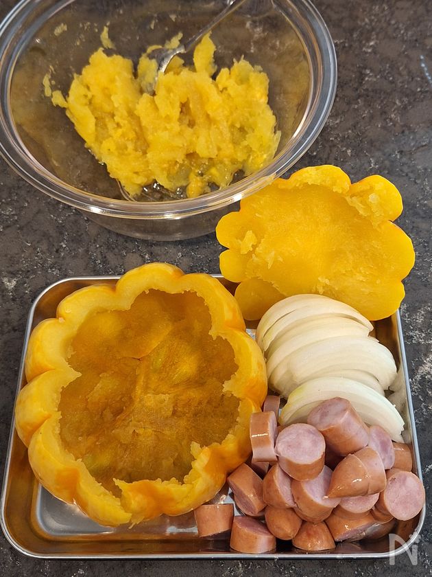 (6) くり抜いた坊ちゃんかぼちゃの実とたまねぎ、ウインナーをボウルで和え、塩こしょうで味をととのえる。