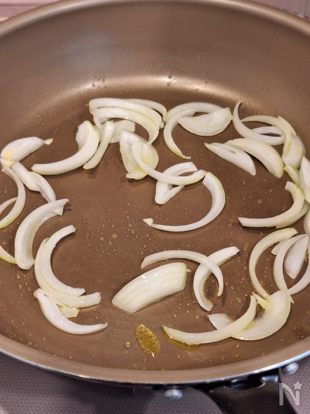 (4) フライパンにオリーブオイルを熱し、たまねぎを炒める。