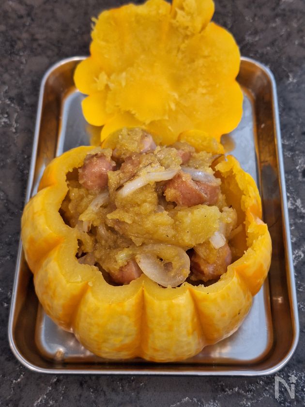 (7) 坊ちゃんかぼちゃの皮を器にして盛り付ける。