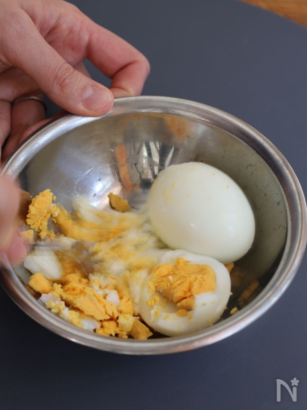 (1) 茹で卵を用意し、フォークなどで潰す。