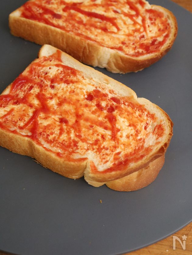 (2) 食パンにバターを塗り、その上にケチャップを塗る。
