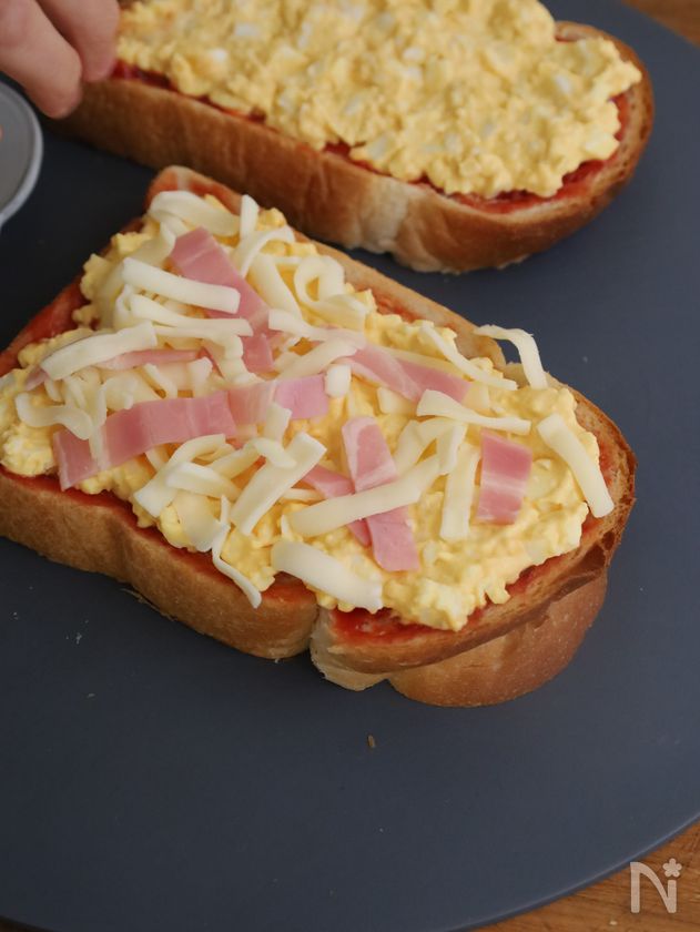 (3) その上に卵ペーストを塗る。ハサミでハーフベーコンを食べやすい大きさに切り、全体に散らす。