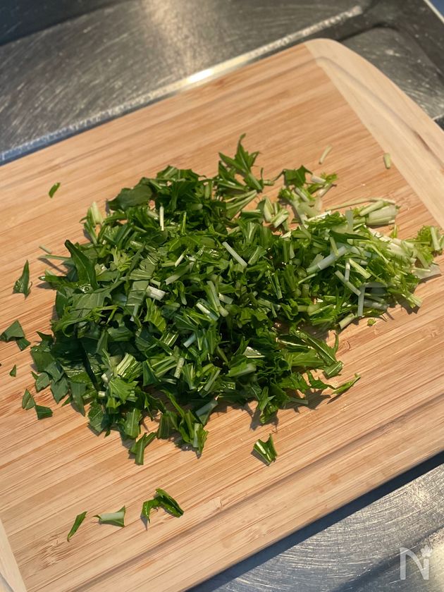 (1) 水菜は根本を切り落とし、1cm幅に切る。