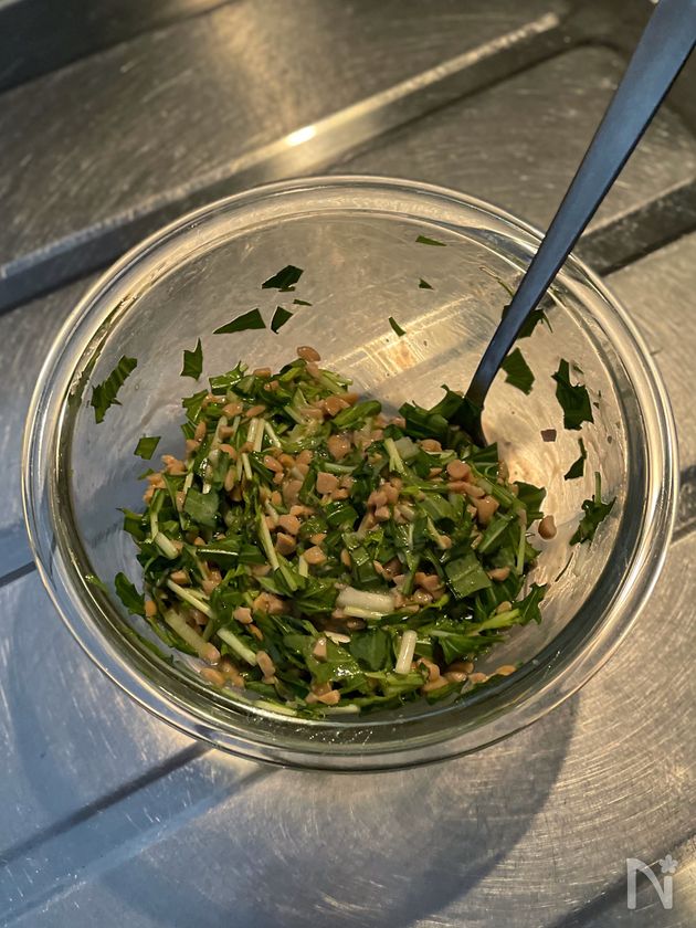 切って混ぜるだけ!「シャキシャキ水菜のわさび納豆丼」