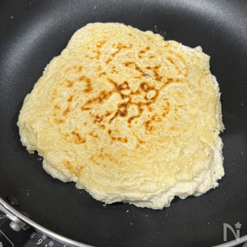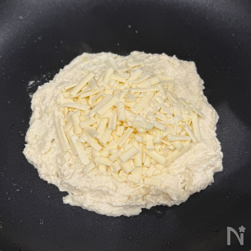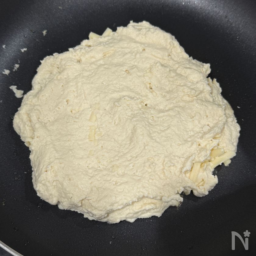 (1) フライパンにオリーブオイルを熱し、1を半分丸く平に広げ入れたら、チーズを乗せる。