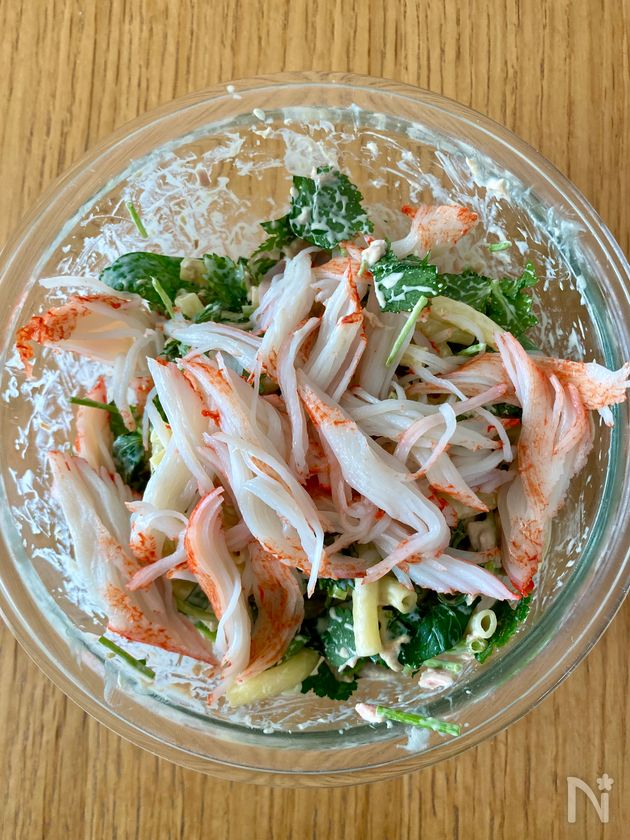 (3) カニカマは手でさいて加え、さっくりと混ぜたら完成。