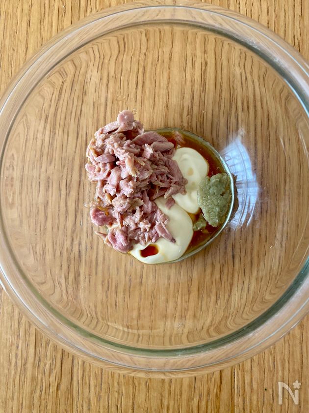 (1) 材料が全部入る位の大きさのボウルに、油をざっと切ったツナ・【A】を入れてよく混ぜる。