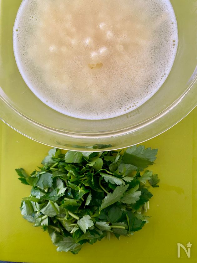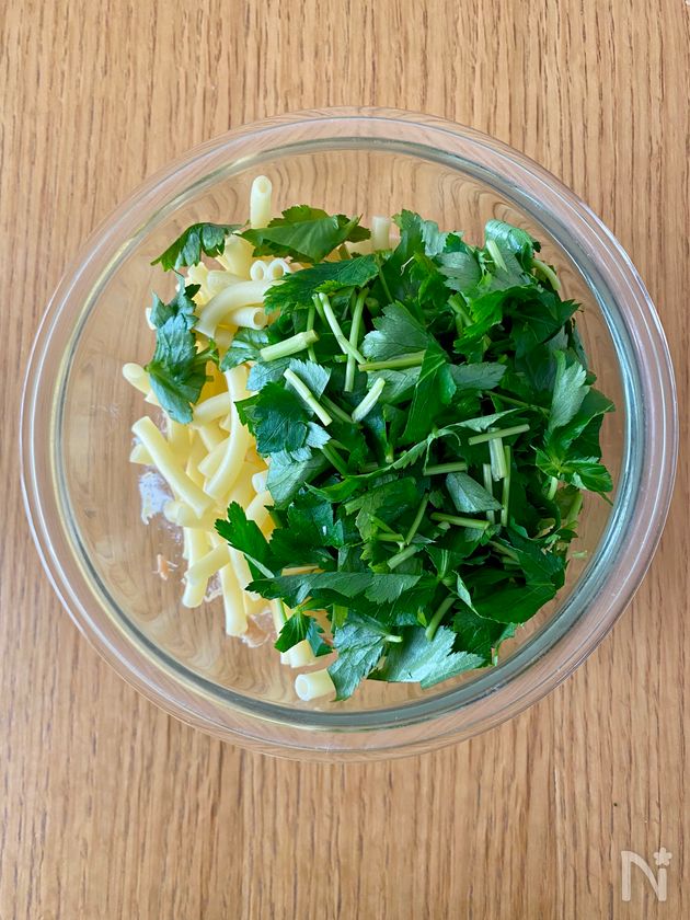 (2) ドレッシングの入っているボウルに、マカロニ・三つ葉を入れて混ぜる。