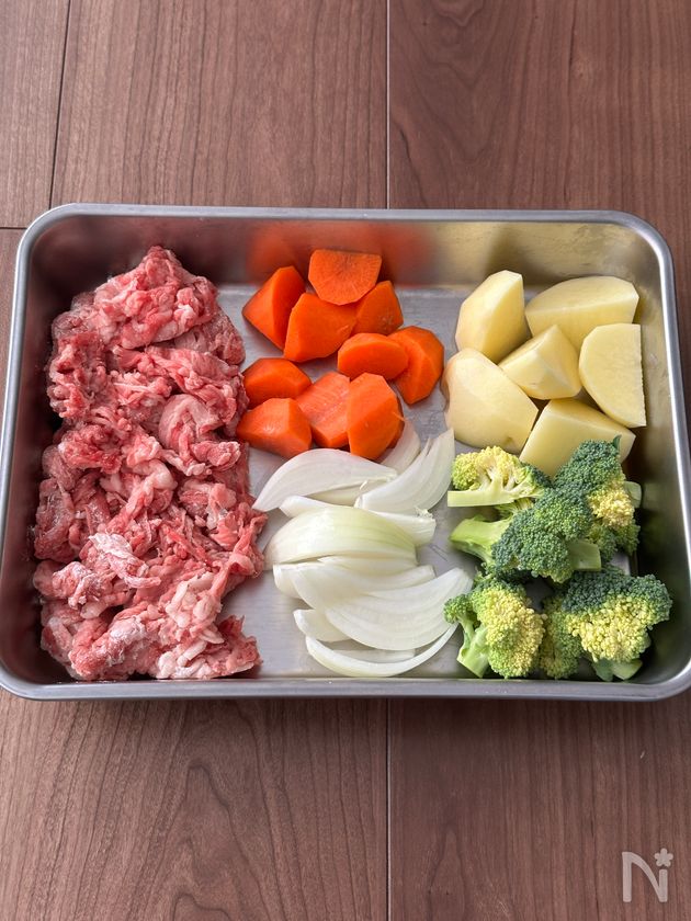 玉ねぎはくし切り、人参、じゃがいもは乱切りにしておく。