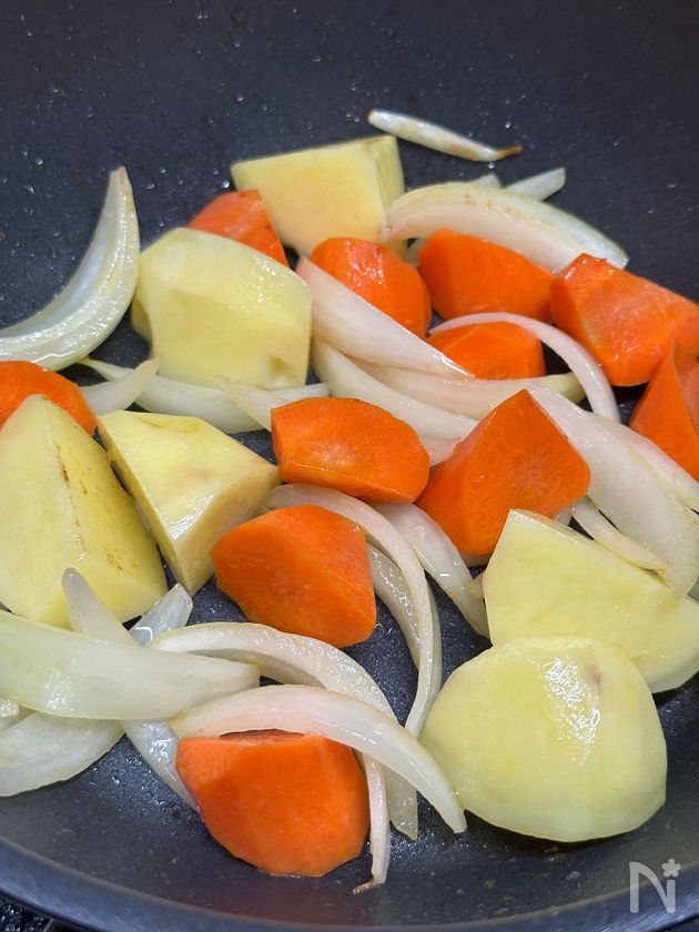 (3) そのままのフライパンにオリーブオイル(野菜用)を入れて玉ねぎ、人参、じゃがいもを中火で炒める。