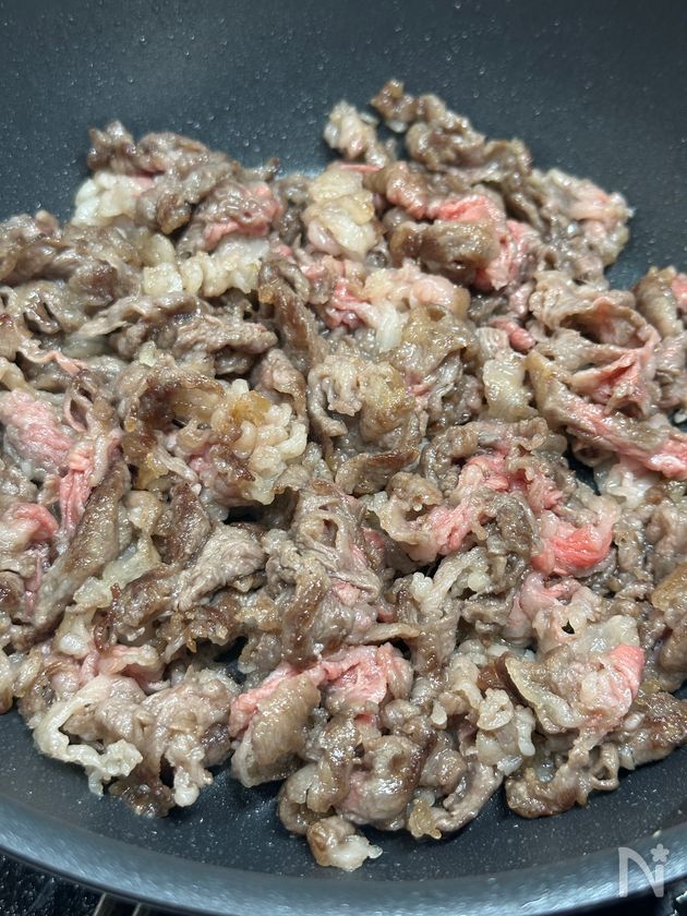 (1) 牛こま肉は塩こしょうと小麦粉をまぶしておく。