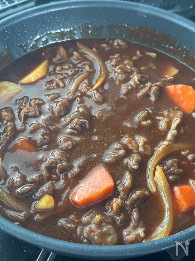 取り出しておいた牛こま肉を加えて時々混ぜながら蓋をして弱火で10分煮込む。