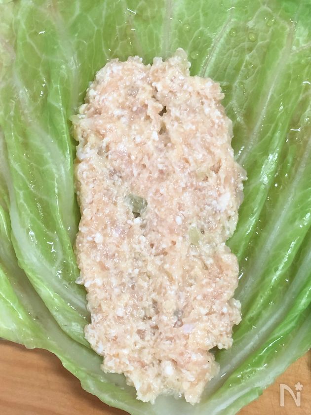 ・(鶏ひき肉を使用しているので)肉だねは成形せず、うすく伸ばしくるくると巻くことで、キャベツの葉が間に入り、肉だねが固くなりすぎるのを防ぎます♪