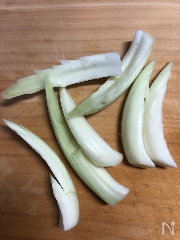 芯に切れ込みを入れて、葉に合わせて指を入れていき剥ぐと剥ぎやすいです♪