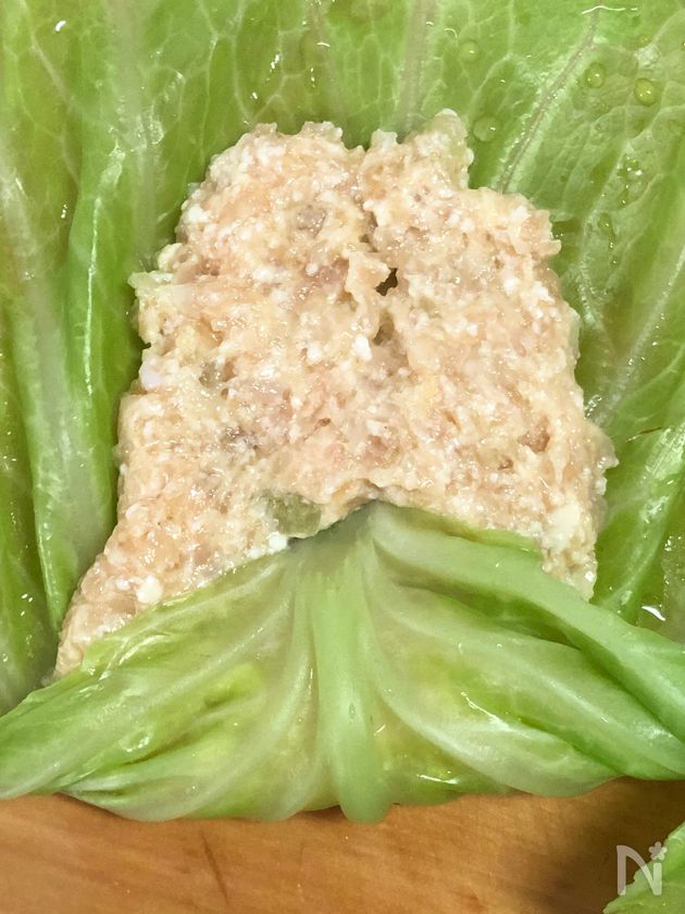 (7) 茹でて柔らかくしたキャベツの葉に、タネをのせ(写真参照)