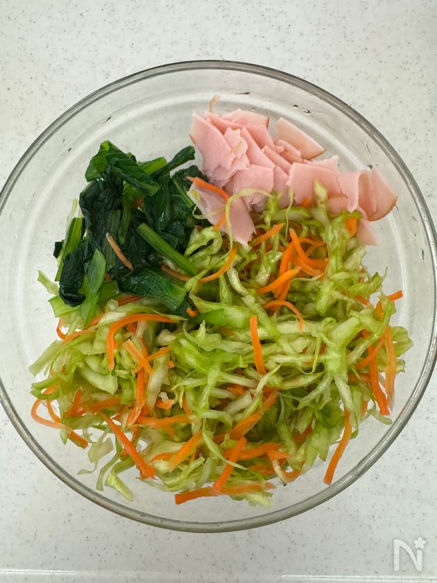 (1) ・キャベツと人参は、千切りにする。塩小さじ2/3で塩もみし、軽くすすいで、しっかり絞る。