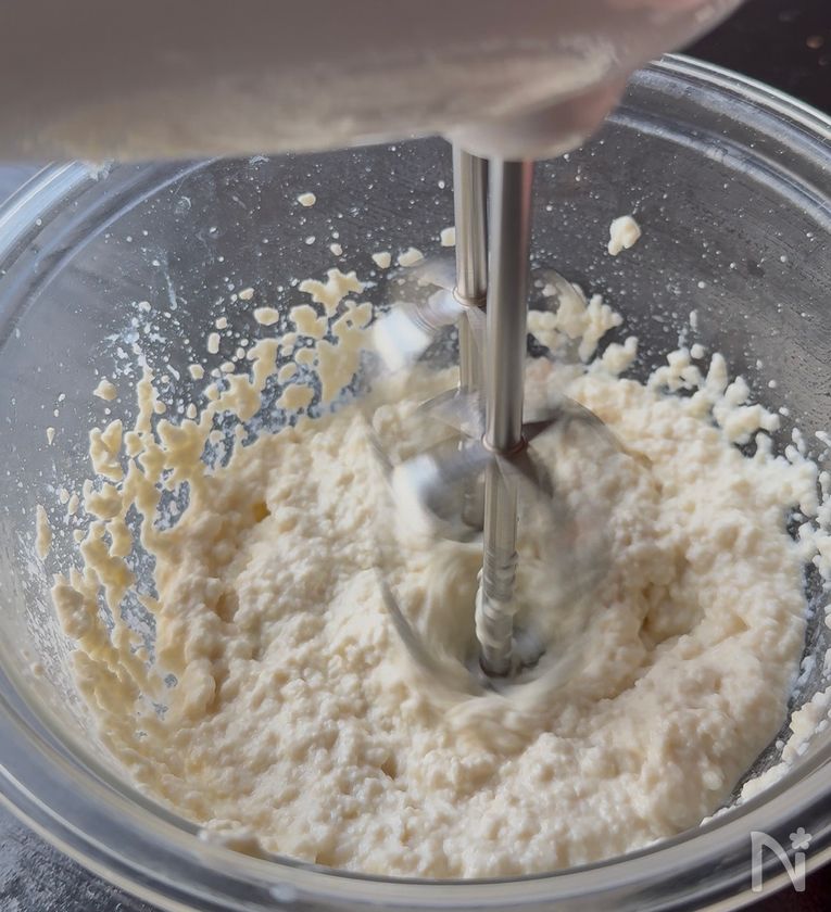 (1) ボウルに水けを切った絹豆腐をいれ、泡立て器でクリーム状にする。