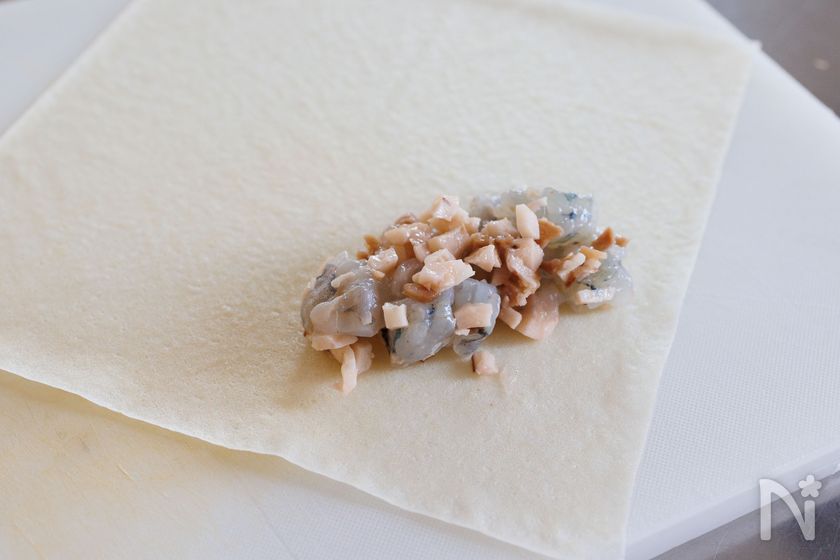 (3) 2を10等分し、春巻きの皮に2をのせる。