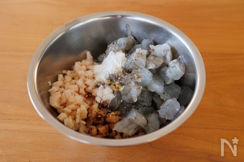 (下準備) むきえびは、塩(小さじ1/3・分量外)と片栗粉(小さじ1・分量外)の順によくもみ込み、水でよく洗い流して汚れを落とす。背わたがあれば取り除く。