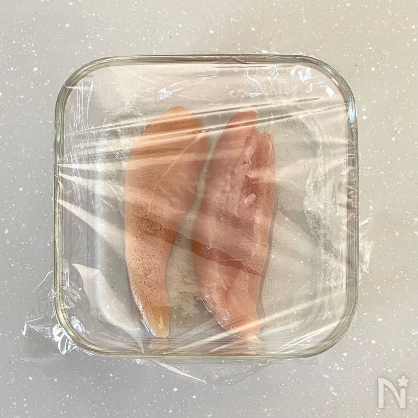 (1) ささみは筋を抜き、耐熱容器に入れて【A】をかけ、レンジ600w2分加熱する。