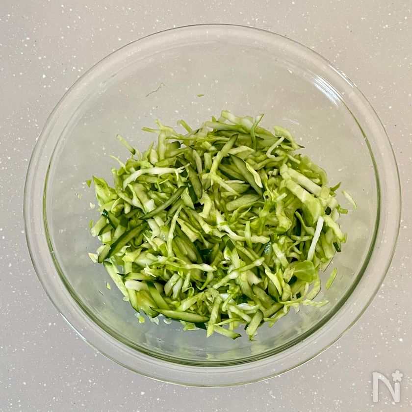 (2) キャベツときゅうりは細切りにして塩揉みし、しばらく置いてしっかりと水気を絞る。