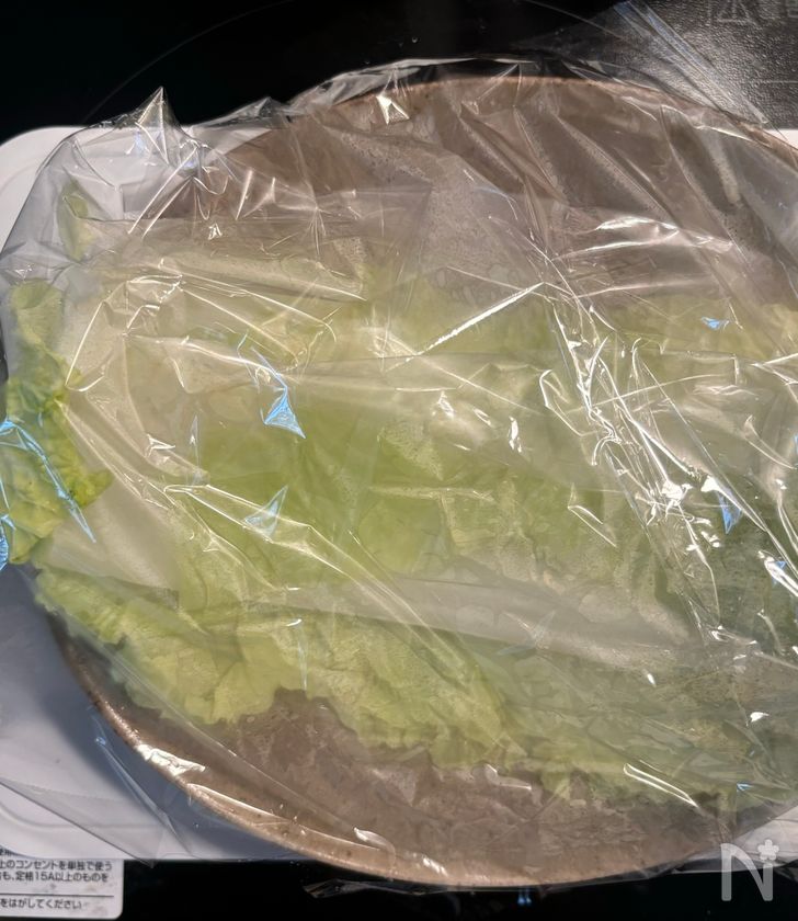 (1) 白菜の葉を剥がし、耐熱皿に入れてふんわりとラップをかけて、600Wで2分温めて柔らかくする。